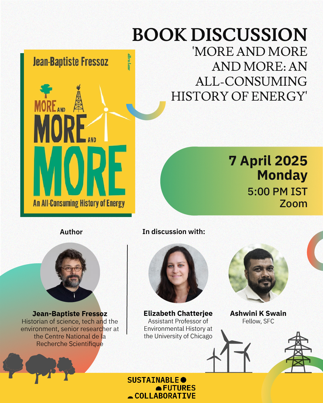 A discussion of the book, ‘More and More and More: An All-Consuming History of Energy’ by the author Jean-Baptiste Fressoz, a historian of science, technology and the environment, a researcher at the Centre National de la Recherche Scientifique, and a professor at the Ecole des Ponts et Chaussées, with Elizabeth Chatterjee, Assistant Professor of Environmental History at the University of Chicago, and Ashwini K Swain, Fellow, SFC.