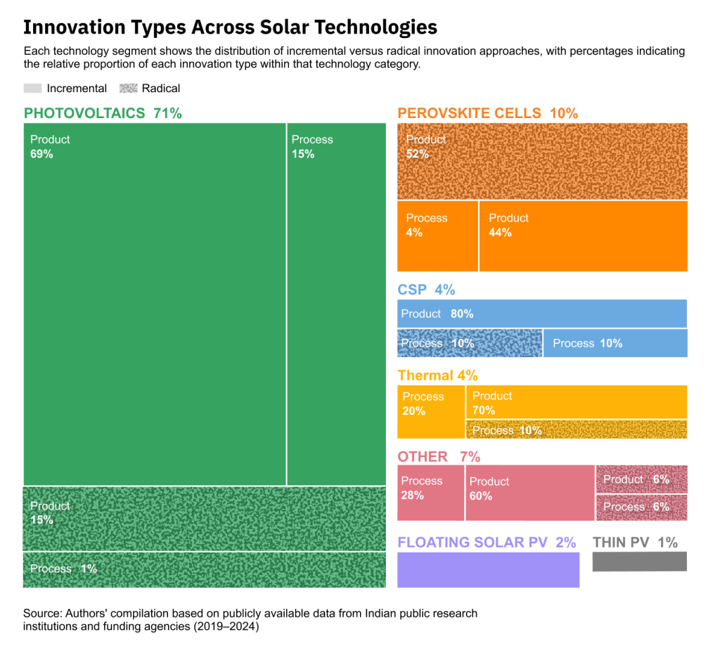 As Figure 2 shows, nearly most public RD&D funding is directed towards incremental innovation, with only about one-third flowing into development of radical next-gen technologies. This tilt toward refining existing technologies raises deeper questions about whether such a tilt is optimal for the long term and what trade-offs it creates for technological self-reliance, competitiveness, and the ability to shape future solar technologies.