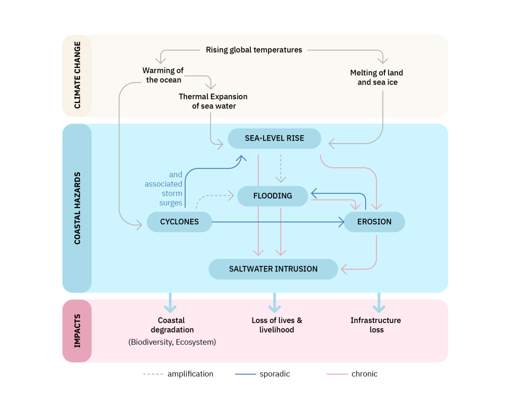 A significant body of literature shows that interactions between acute coastal hazards, such as cyclones and storm surges, and chronic coastal hazards, such as SLR, amplify impacts across social and ecological systems. Hence, continued reliance on single-hazard planning can result in blind spots and maladaptation.